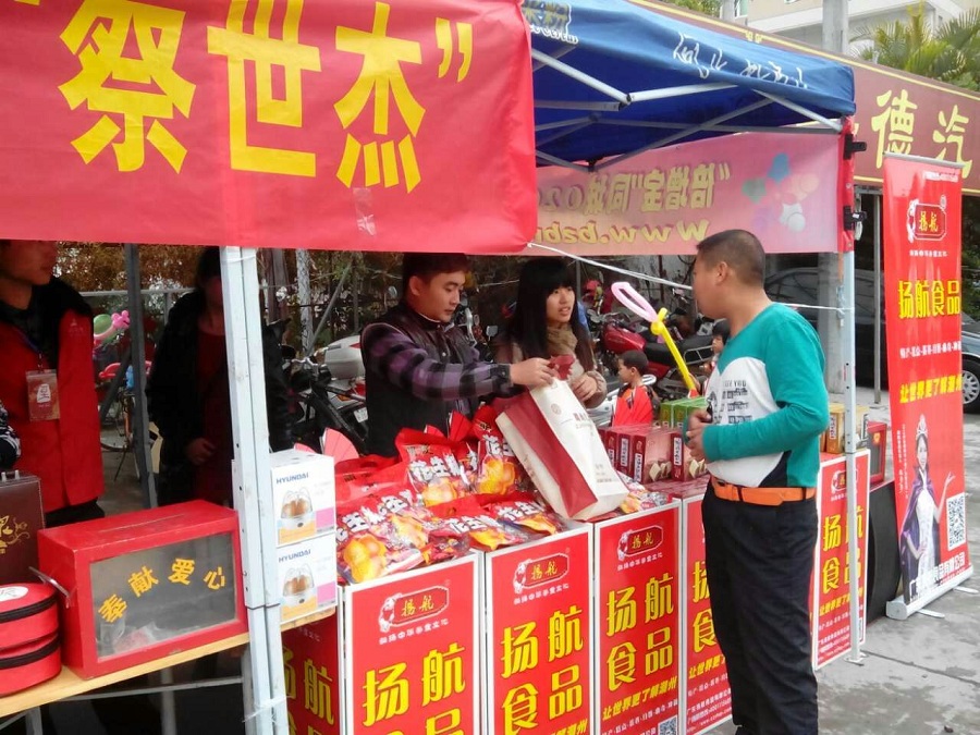 2015年1月25日,廣東揚(yáng)航食品積極參與由潮州市至德慈善會(huì)、潮州市鳳新竹圍村委在大道大新鄉(xiāng)路口主辦的|“為14號(hào)晚潮州民生報(bào)道的鳳新22歲蔡世杰籌治療費(fèi)捐款活動(dòng)義賣(mài)義演”的慈善活動(dòng)。