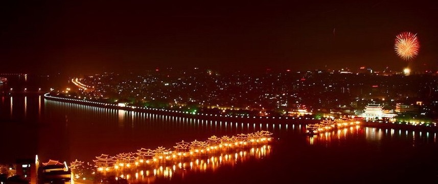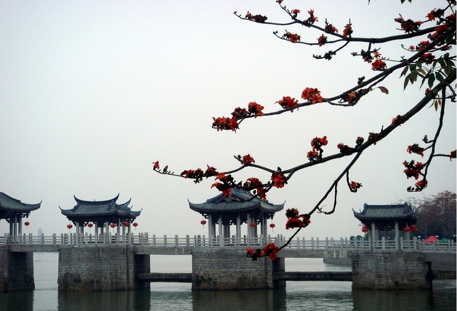 湘子橋,最初名叫濟川橋,雄跨韓江兩岸,正對潮州東門樓。“湘橋春漲”,為潮州八景之一。民謠唱曰:“到廣不到潮,枉費走一遭;到潮不到橋,白白走一場”。春暖花開,韓江水漲,江面增闊,湘子橋東西段和中間十八梭船連成一線,宛如長龍臥波。上游兩岸的滴翠竹木,下游仙洲盛開的桃花和沿江的綠柳都美若仙境!