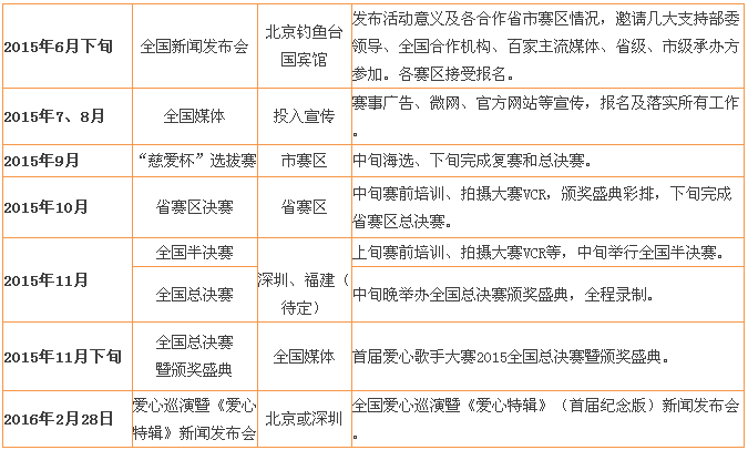 全國舉行“慈愛杯”歌手比賽,從各參與省市篩選優(yōu)秀選手進(jìn)入省賽區(qū)乃至全國總決賽。