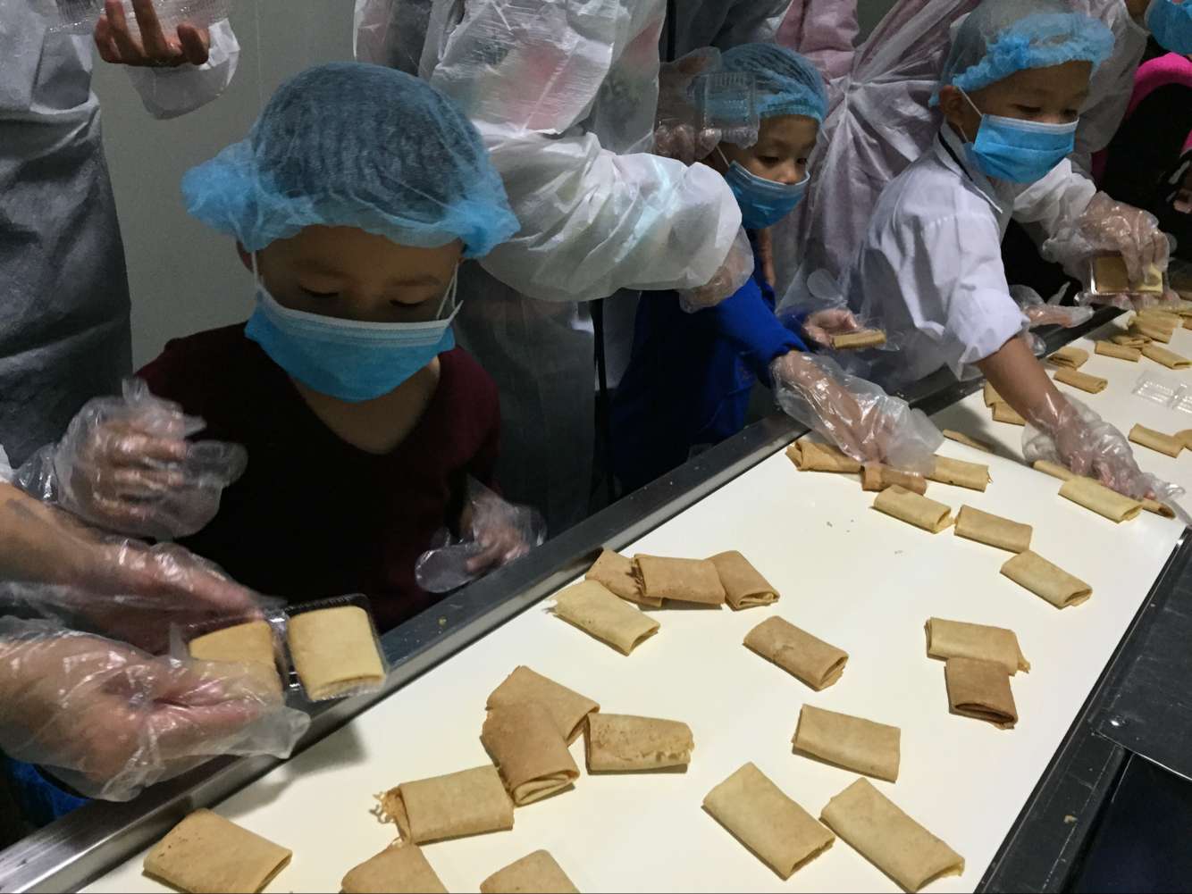 參觀完生產(chǎn)車間,家長(zhǎng)和孩子們親自體驗(yàn)了一番揚(yáng)航蛋卷的制作過(guò)程,在揚(yáng)航蛋卷師傅耐心的示范和指導(dǎo)下,孩子們興致勃勃地開(kāi)始裝蛋卷,別看只是裝蛋卷,小朋友們可絲毫也不馬虎。