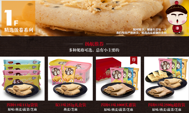 在線上,將主推我們的拳頭產(chǎn)品—手工蛋卷系列,這款真正零添加的蛋卷,主料精選土雞蛋,不添加任何添加物,并堅持手工制作,口感純正,蛋香濃郁。在線上提供了試吃裝、禮盒裝、家庭裝和量販裝四種規(guī)格,供不同的需求人群選擇。揚(yáng)航手工蛋卷力求在三年內(nèi)做到全國蛋卷領(lǐng)先品牌。