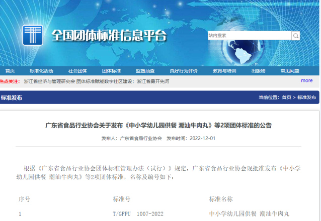 2022年12月01日,由廣東揚(yáng)航食品股份有限公司參與制定的廣東省食品行業(yè)協(xié)會(huì)團(tuán)體標(biāo)準(zhǔn)《中小學(xué)幼兒園供餐 潮汕牛肉丸》正式通過全國(guó)團(tuán)體標(biāo)準(zhǔn)信息平臺(tái)審核。此標(biāo)準(zhǔn)的制定填補(bǔ)了國(guó)內(nèi)及行業(yè)的空白,解決了潮汕牛肉丸進(jìn)入中小幼兒園供餐潮汕牛肉丸無標(biāo)準(zhǔn)可依的問題。