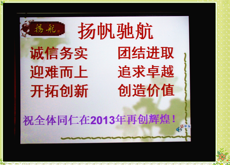 大會的最后,在“讓我們揚航人秉著誠信務實!團結(jié)進?。∮y而上!追求卓越!開拓創(chuàng)新!創(chuàng)造價值!的精神,揚帆馳航!”的口號聲中圓滿結(jié)束!