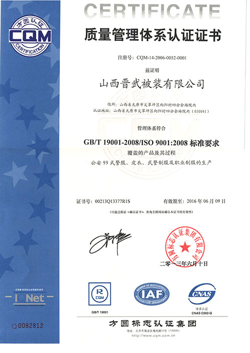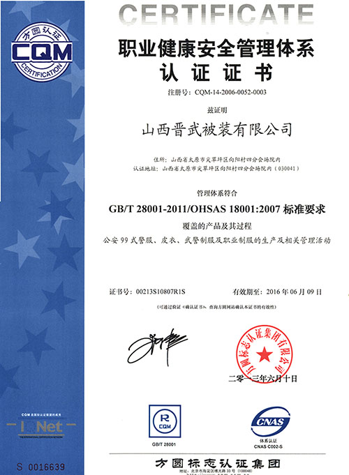 晉武被裝自1999年先后通過(guò)了ISO9001、ISO14001和OHS18001認(rèn)證,并在2009年被獲得了“中國(guó)優(yōu)質(zhì)產(chǎn)品”證書(shū),同時(shí)先后從日本、德國(guó)、美國(guó)引進(jìn)先進(jìn)的生產(chǎn)設(shè)備和先進(jìn)的生產(chǎn)工藝,在2011年年初,我公司被評(píng)為“質(zhì)量、服務(wù)、信譽(yù)AAA級(jí)金牌單位”。